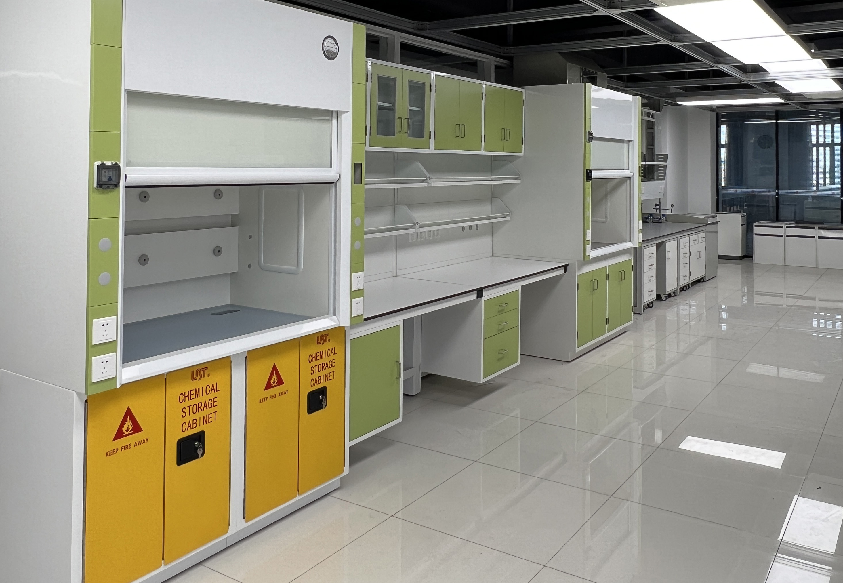 主体采用双层国标1.0mm镀锌钢板(鞍钢优质钢材),外层为钢板,内层为抗腐蚀内衬材料;台面前为应采用氟化物涂层,其余部位钢制部分采用环氧树脂涂层;移门为厚度≥5mm的双层夹膜防爆安全玻璃;所有通风柜的内衬材料(抗倍特板)为≥5mm厚高强度、易清洗、耐腐蚀、耐高温的材料制作,导流板必须与内衬为同一材料;底柜柜体:柜体与实验台柜体制作要求同;通风柜照明:两个荧光灯管,快速启动类型;带液晶控制面板,控制风机、开度、灯的控制。